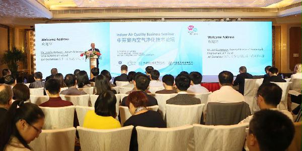 中建科技集团有限公司副总经理李丛笑先生出席会议并做了“未来建筑与室内空气品质”的主旨报告。中科院芬兰籍院士Kulmala团队核心成员Joni Kujansuu博士、中国建筑科学研究院建筑环境与节能研究院副院长路宾先生、芬兰国家技术研究院VTT高级研究员Hannu Salmela先生分别以“大气污染对室内空气质量的影响”、“中国室内空气净化领域现状与发展”、“芬兰的室内空气净化技术创新综述”为题做了学术报告。芬兰十余家公司负责人相继介绍了其前沿技术及核心产品,并与中方公司进行深入技术交流。